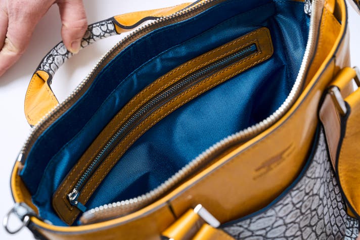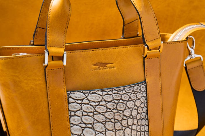 クロコダイル革は、その特徴的な鱗模様と力強い凹凸感が魅力の、ワイルドで高級感のある素材です。通常、クロコダイルの製品は外装全体に使うことが多く、それ自体がとても高級感のある非日常的な演出として確立された定番の作り方です。