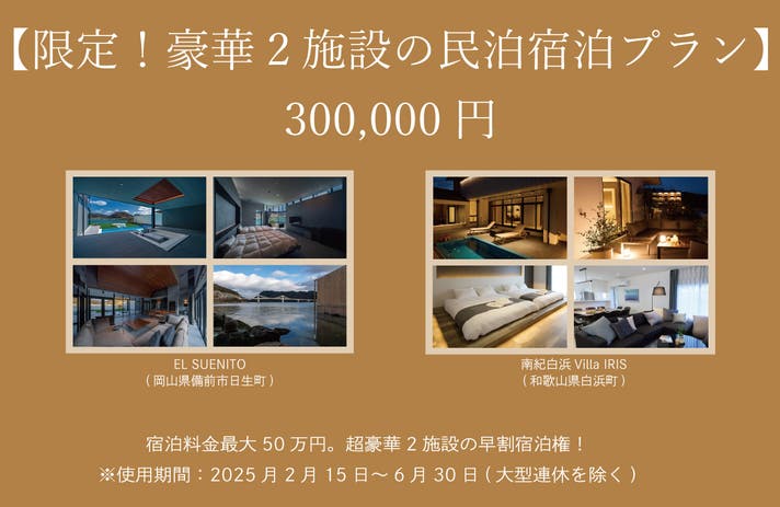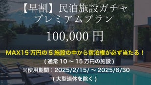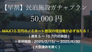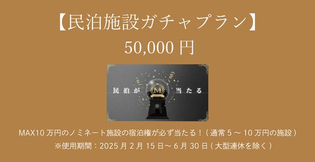 MAX10 万円のノミネート施設の宿泊権が必ず当たる! ( 通常5 ~ 10 万円の施設)