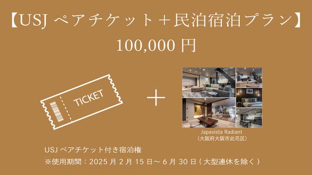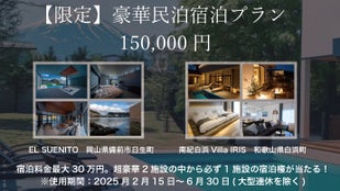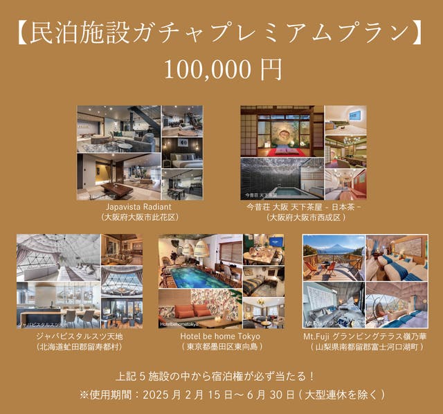 - ノミネート施設の宿泊権が必ず当たる!普段宿泊するよりお得な価格で民泊施設の宿泊が可能。