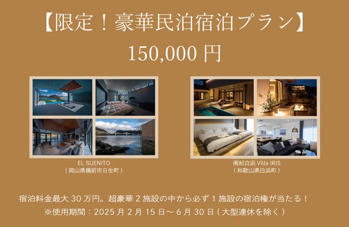 上記の豪華宿泊2施設の中から必ず1 施設の宿泊権が当たる!