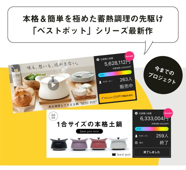 三重県四日市市の特産品である萬古焼と鉄の鋳物を融合させることで、ご家庭で手軽に本格的な土鍋ごはんが作れる調理器具へ進化を遂げた「best pot. 」は、おかげさまでMakuakeでも大変な高評価をいただき、現在では有名高級ホテルのバイキングにも採用されるなど、その活躍の場をさらに広げております。