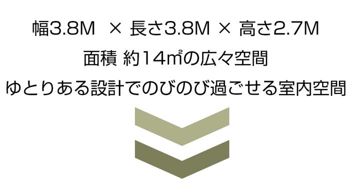 室内は天井が高く開放的で、ラグジュアリーなグランピング空間を演出。中央は約2.7mの高さがあり、両サイドも2.0〜1.3mと高めなので、立ったまま移動したり、大型ギアを設置しても圧迫感がありません。