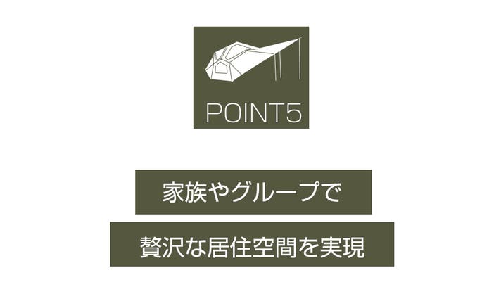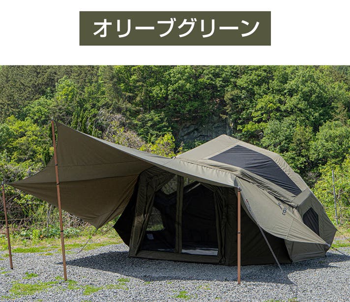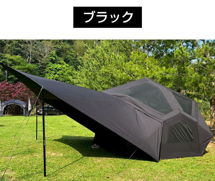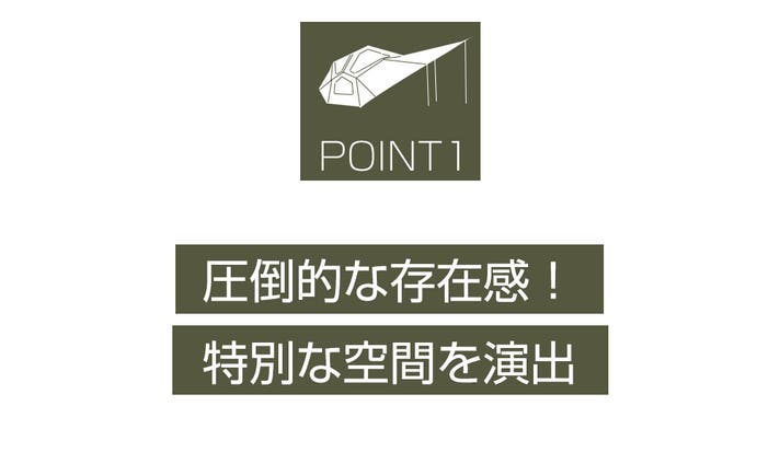 本体サイズ、縦横3.8m,高さ2.7mの八角形のドーム型テントと、シュッと伸びた延長タープの圧倒的なシルエットは、キャンプ場で主役級の存在感を発揮します。