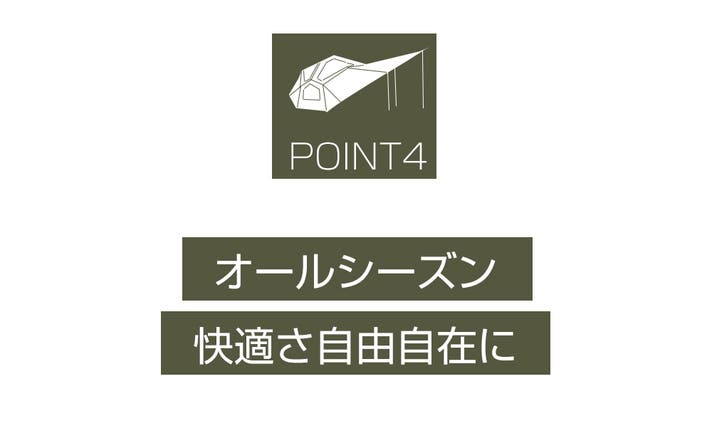 ファスナーで簡単に開閉できるポリコットン窓は、防風や遮光に優れ、寒暖差の大きい環境や冬キャンプでも優れた断熱効果を発揮します。