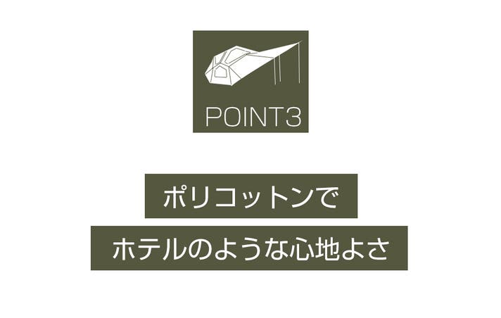 風合いのよいポリコットン生地が、まるでホテルのような快適で洗練された空間を演出。優れた断熱性・通気性を備え、グランピングのような上質な滞在体験を叶えます。