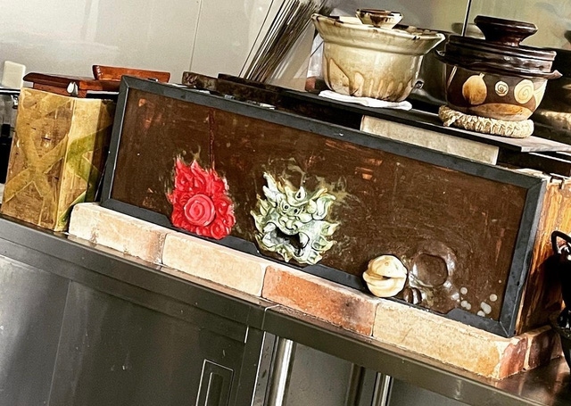 カウンター内には瀬戸の作家、山根氏の「地獄」焼き台や釜飯を炊く釜、