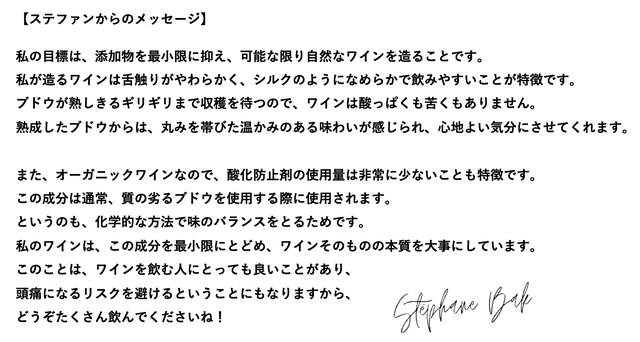 ステファン・バクのワインは現在フランス国内のみで販売中ですが、ハイレベルなワイン愛好家の多い日本への傾倒が強く、今回株式会社ビーザイセフルにて数名のワイン愛好家との試飲会を開催して慎重に評価、日本でのニーズを確証しました。そして収益性などの検討を精査し、リーズナブルな価格で販売できる事となりました。日本での専売契約を締結、MAKUAKEにてスタートアップして輸入販売を開始いたします。