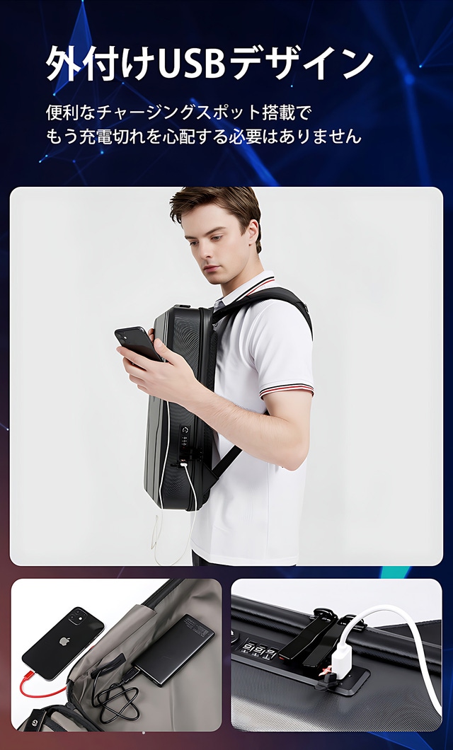 外付けUSB搭載しているため、中のモバイルバッテリーとUSBケーブルを通してスマホ充電が可能です。