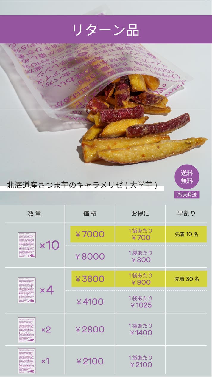 「Makuake(マクアケ)」は、実行者の想いを応援購入によって実現するアタラシイものやサービスのプラットフォームです。このページは、 フードカテゴリの 「幻の雪国育ち!北海道産紅はるか冷やしキャラメリゼ」プロジェクト詳細ページです。