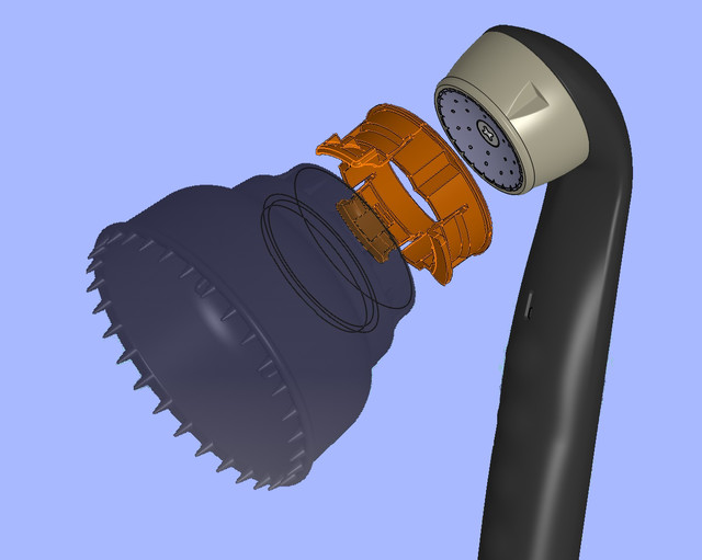 髪をすすいでもらうときの「ちゃぱちゃぱ」を再現するために、伸縮素材を用いることは早い段階から決まっていましたが、それ以外のことが決まらず、苦戦していたところ、シャワーヘッドのノウハウを持つ(株)田中金属製作所のシャワーヘッド「アリアミスト」の紹介とご協力をいただきながら、たどり着いたのが今回ご紹介する