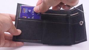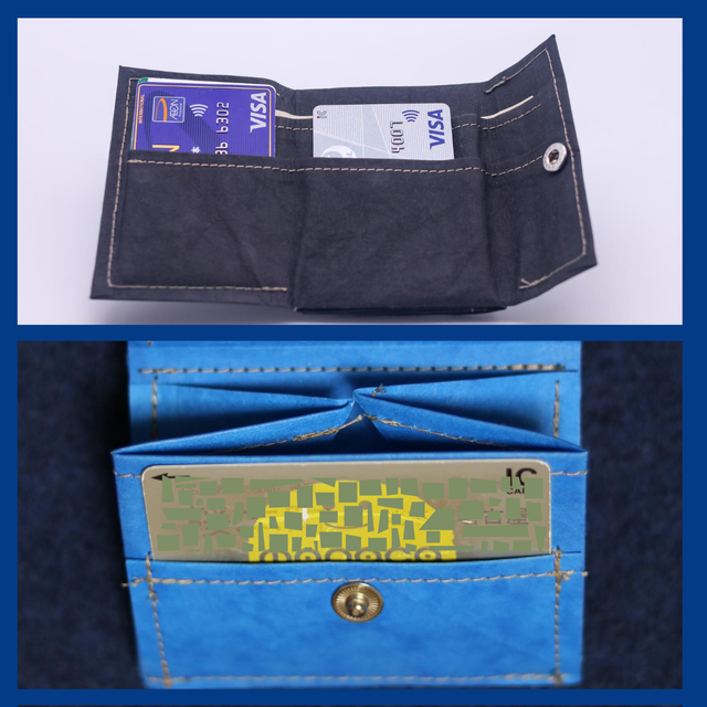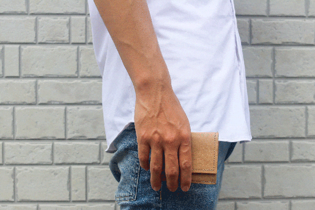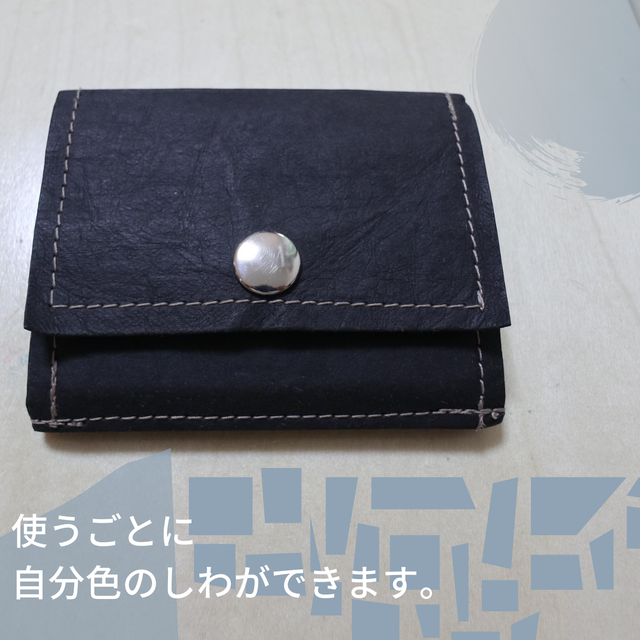 通常、レザーや合皮の三つ折り財布にすると、生地に厚みがあることで厚さが3㎝程発生してしまうものですが、素材を紙に近いセルロースにすることでかなり薄い厚みを実現。約1.5㎝とおおよそ半分の厚みまで縮小することに成功しました。※中に何も入れていない状態