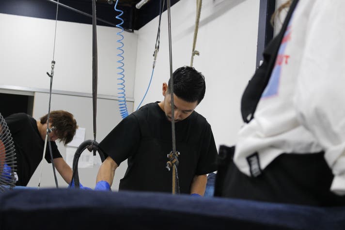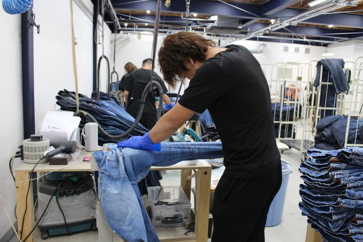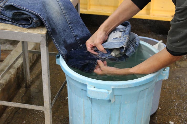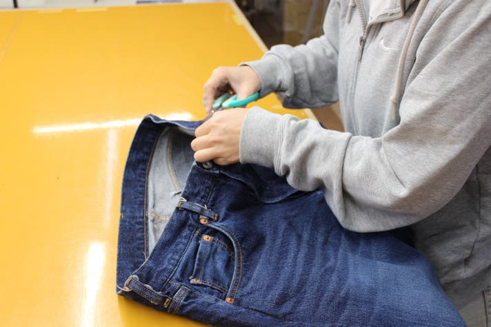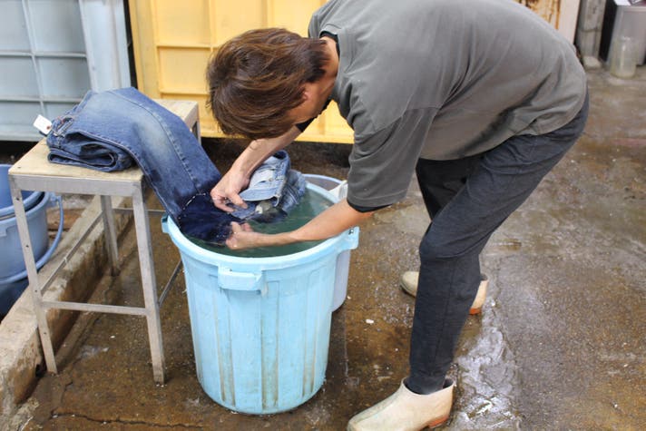 スリと呼ばれる工程は、デニムに立体感やメリハリを与える重要な作業。