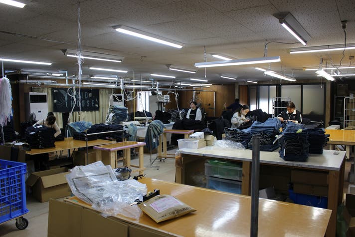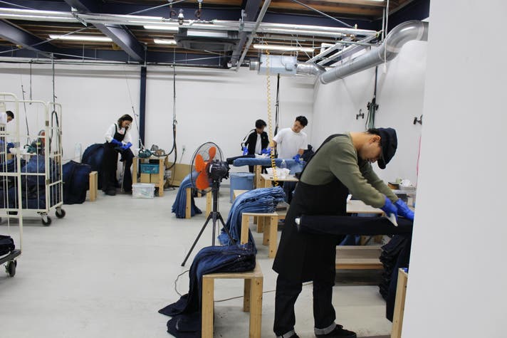 洗い加工は自社工場で行い、縫製やスリ、プレスは各工程に長けた協力工場で丁寧に仕上げます。