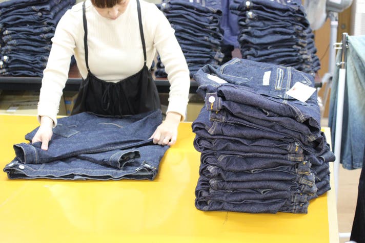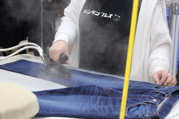 縫製、スリ、洗いを経て完成したデニムは、最後にプレス職人の手によって形を整えます。