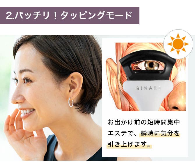 お出かけ前や、大切な方と会う前、さらには大事な商談の前に使っていただきたいのが「タッピングモード」です。シャキッと心のスイッチが入るような子気味の良いリズムの施術で目元にアプローチします。