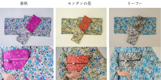 着物は吸水速乾の自宅で洗えてシワになりにくい、東レのセオα生地を使用しています。この生地は5月~9月まで着用できる『単衣・夏着物』として話題になっています。シルク半幅帯はリバーシブルになっていて、シルクの生地に表は紅型の色合い、裏は色の濃淡でデザインしました。裏を使用すると紅型の着物にも合わせる事ができ、シルクを使用する事で一年中お使いいただけます。長さが4m35cmあり、柔らかく締めやすいので変わり結びも簡単。