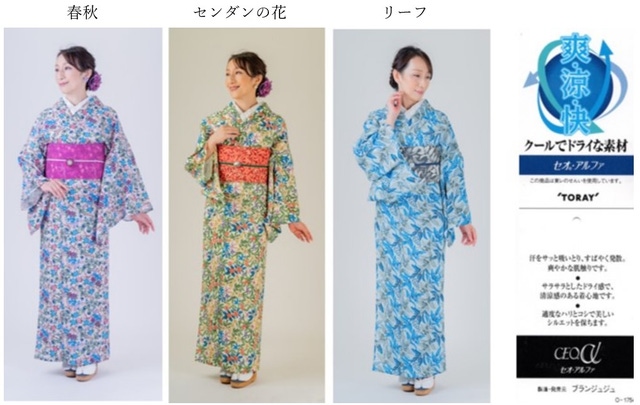 夏着物としては東レのセオα生地を使用しています。この生地は吸水速乾でサラッとした肌触りです。自宅の洗濯機で洗えて、シワになりにくい素材です。ポリエステル素材ですが、昔の生地とは違い、涼しい夏素材です。何といっても暑い夏に汗をかいた後、自宅で洗えてシワになりにくいとは素晴らしい!この素材は今着物業界では話題の生地で、5月~9月に着用でき、単衣・夏着物として、また浴衣として愛用されています。