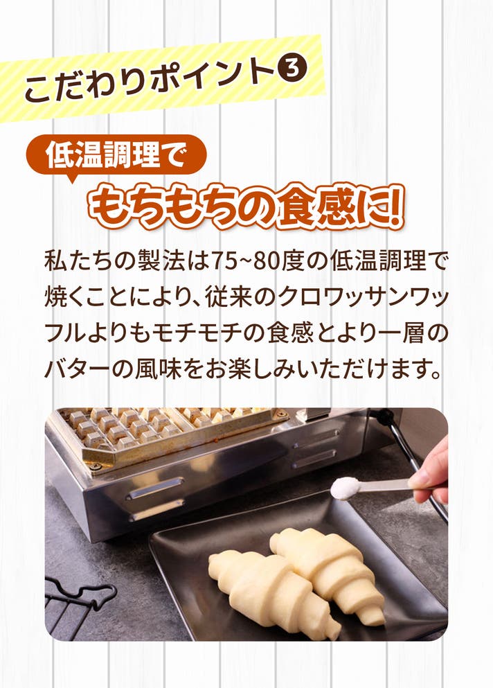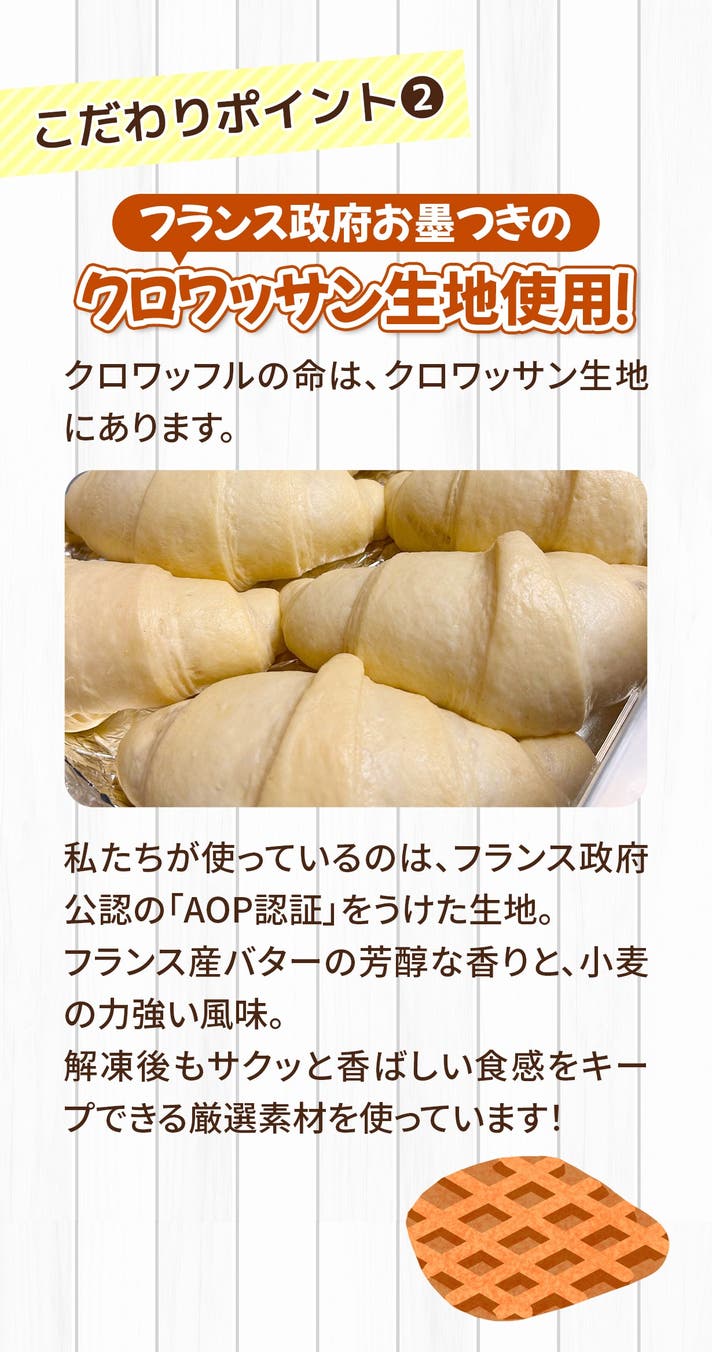 今回のクロワッサンワッフルは、冷凍でもお店で食べる美味しさをそのまま再現できるよう、
