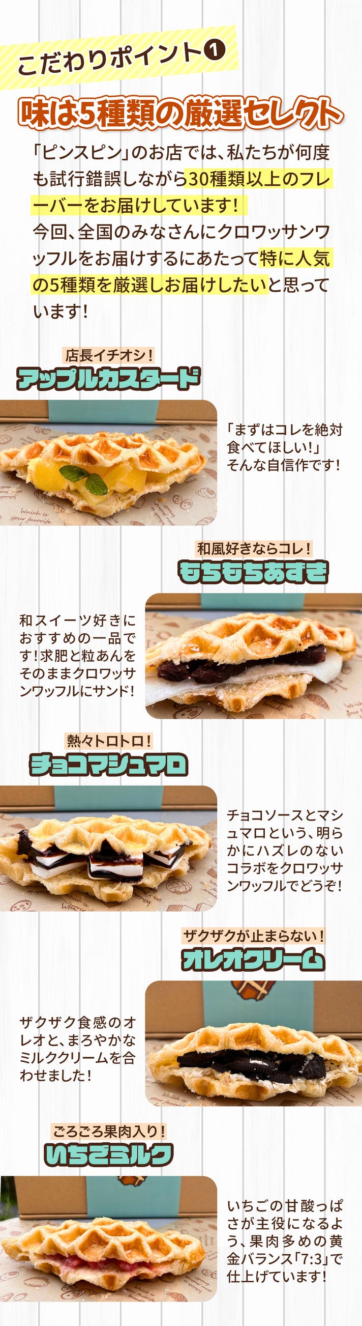 - クロワッサン+ワッフルの新食感!30種類の味の中から特にお店で人気の5種類をお届けします!