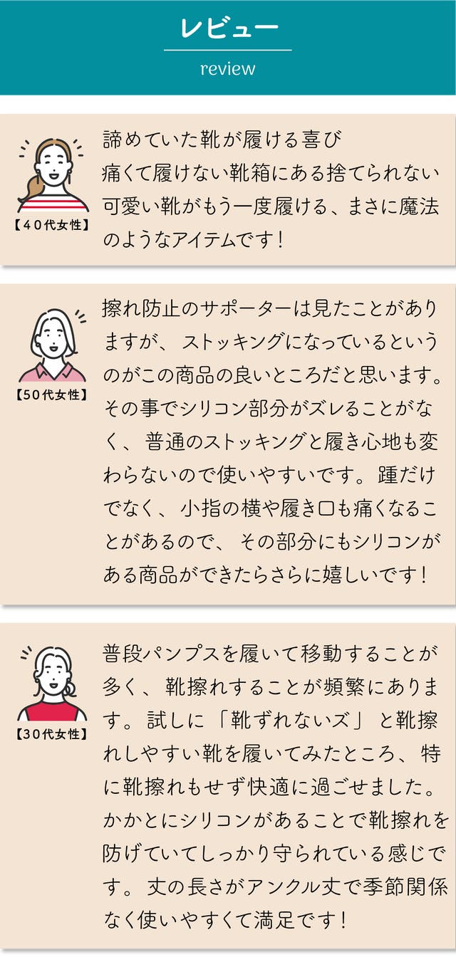 ストッキングに直接シリコンが装着されているため、絆創膏や靴ズレ防止グッズのように、歩くたびにズレたり、はがれてしまう心配がありません。