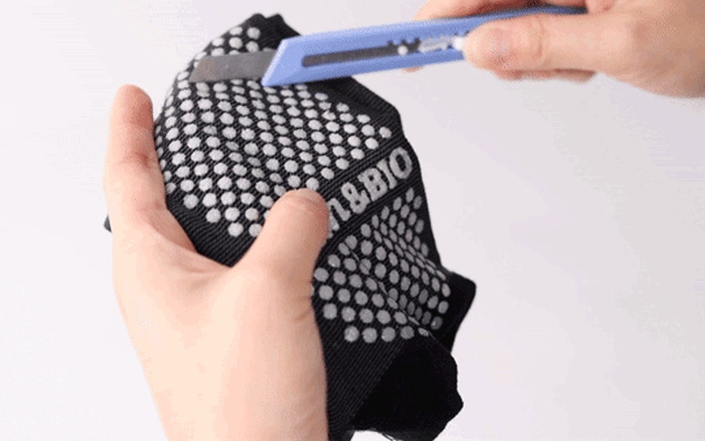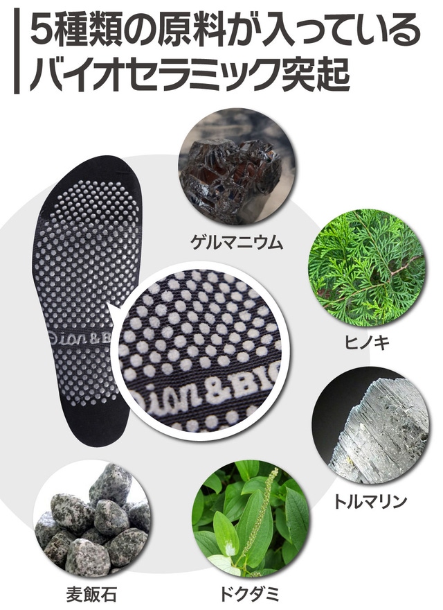 強力に付いているバイオセラミックの突起は靴下の内側に付着しているので、刺激効果だけでなく汗や靴下の滑りを防ぐことができます。