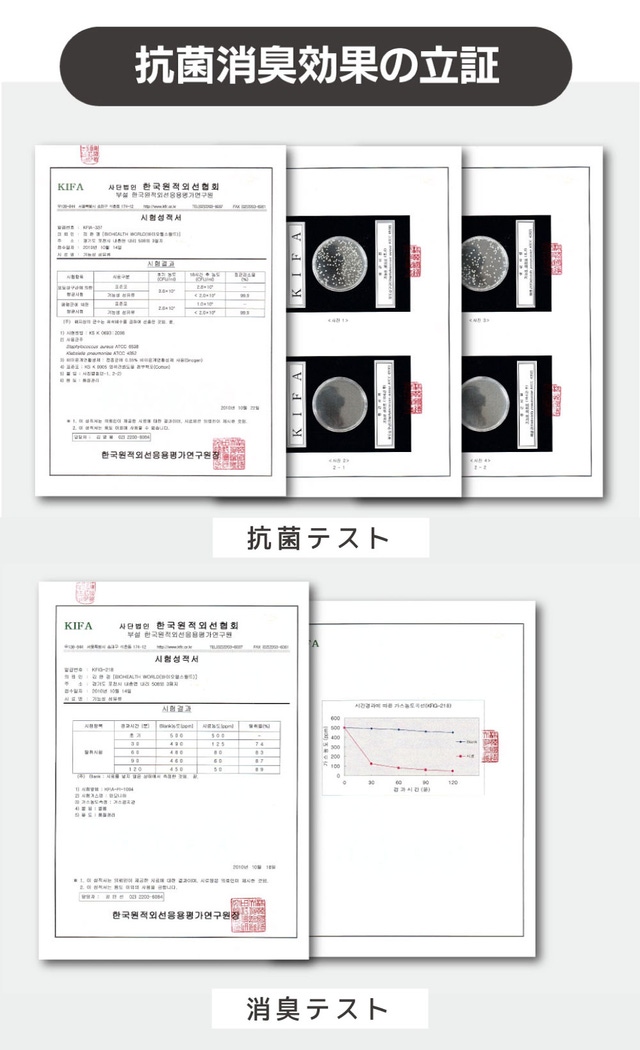 Bio Health Worldは公の機関を通じて抗菌・消臭テストを行い、抗菌、消臭効果があることを確認しました。