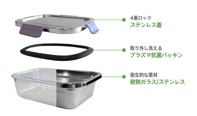 バイオメイドのプロジェクトで会えるリターン品は、ガラス/ステンレスの2つの素材の容器に、プラスチック蓋ではない、ステンレス蓋なのに4面ロックで完全密閉を実現した容器になります!