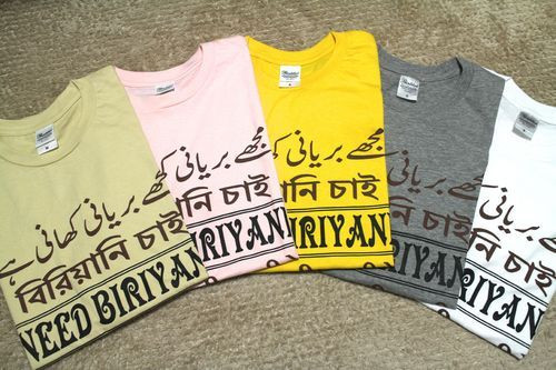 最後は、日本ビリヤニ協会オフィシャルビリヤニTシャツの国際版です。ビリヤニが食べられている地域の5言語(ウルドゥー語/パキスタン、ベンガル語/インド西部・バングラデシュ、英語/全域、ヒンディー語/インド、タミル語/南インド・スリランカ)で「ビリヤニほしい!!!!」と書いてあります。インド料理屋や南アジアへの旅行でバカウケ間違いなしです(笑)。実際インドに着ていった体験談はこちら。