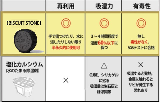 【BISCUIT STONE】はコンパクトで携帯性にも優れているので、ご家庭の靴箱やクローゼットの除湿、カメラなどの精密機器の保管などのお役立ていただけると確信しています。