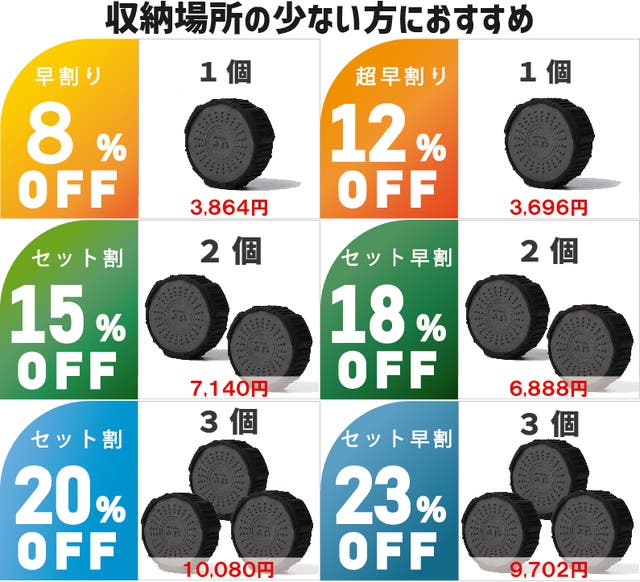 A、30L以上の空間で使用すると、すぐに吸湿量の限界に達してしてしまうため、頻繁に加熱しなくてはいけなくなります。また、加熱したとしても外からの湿度が蔓延しているため全体の湿度を抑えるまでの効果は期待できません。30Lまでの密閉空間でより効率よく能力を発揮できるよう開発されているため、ある程度小さな空間でのご使用をおすすめします。