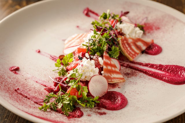 新潟県の八海山サーモンと苦味や土感のあるビーツをタルタル仕立てに。