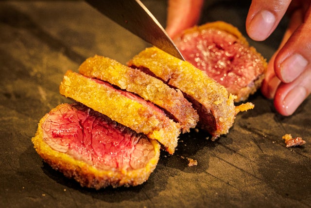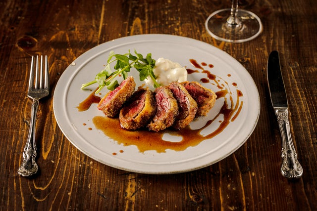 ハラミをカツでレアに仕上げて、赤ワインとフォンドボーをベースに、酸味のあるシェリービネガーと隠し味の中濃ソースを加えた特製のソースで召し上がっていただきます。
