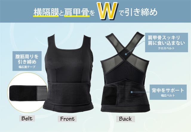 お腹を引き締める幅広面テープが、腹筋周りを引き締めるので横隔膜をサポート。背面のクロスベルトが肩甲骨を引き締めることで、姿勢を保ちながらインナーマッスルを同時に鍛えることを実現しました。