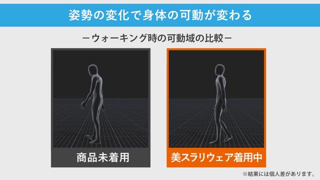 美スラリウェアを着用すると、背筋がまっすぐ伸びて、歩幅も広がり腕もしっかり振りながら歩いています。