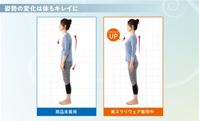背筋が伸びバストラインやウエストラインにメリハリが出てきます。見た目の印象も大きく変わります。