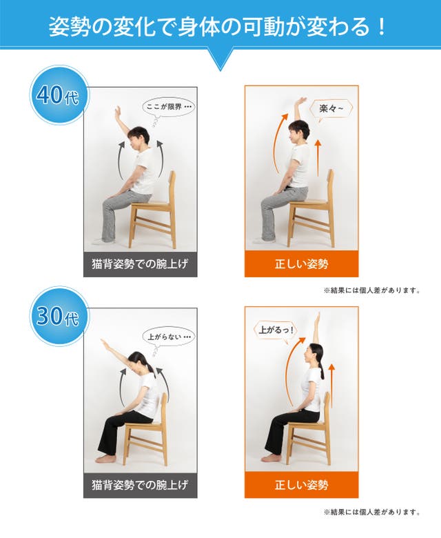 猫背姿勢で腕を上げようとしても、身体の可動域は狭くなり腕が上がりにくいのに対し、背筋が伸びることで肩周りの可動域が大きくなり、負担なく腕を上げることができます。