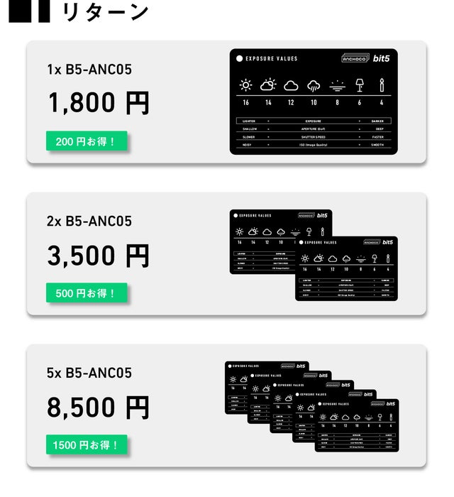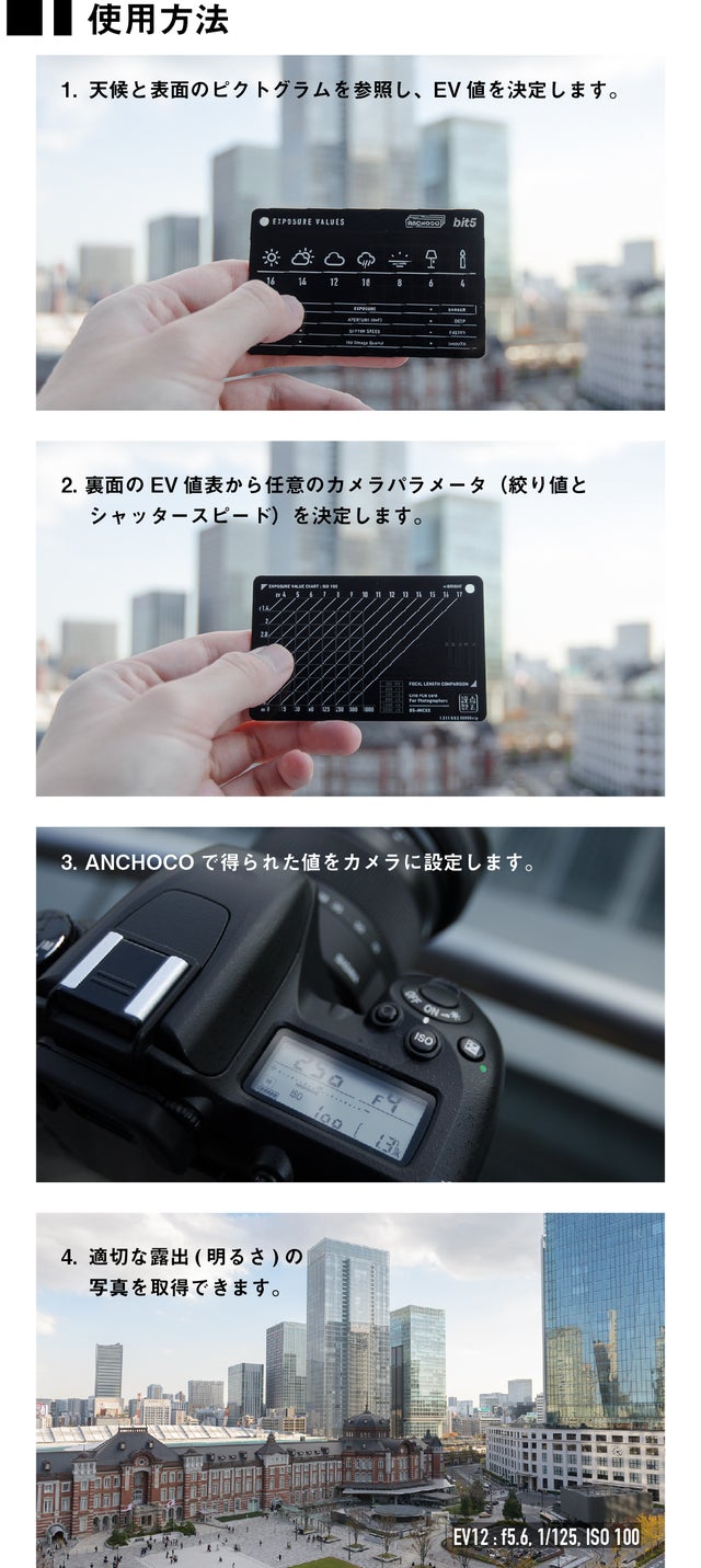 このカードは上記のような経験があり、写真の知識を増やしたいと考えている方に向けてデザインされました。このANCHOCOカード1枚で、写真の基礎である「露出」を学ぶことができます!