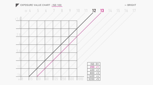 ANCHOCOの露出表はISO100の時のものであり、もし異なるISO値*を使う場合は右下にあるISO表からEV値を足してください。(ISO 200の場合はEV13(12+1)の線を見てください)