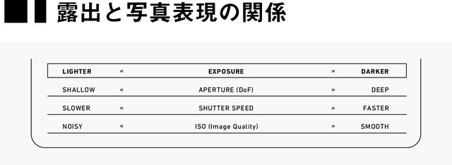 表面の下部には露出と写真表現についての対応表を記載しています。