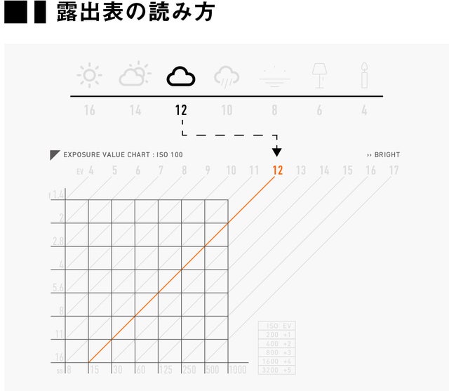 例えば天候が曇りの場合、表面のピクトグラムからEV値を12と決定し、裏面の表からそれに対応したナナメ線を読みます。