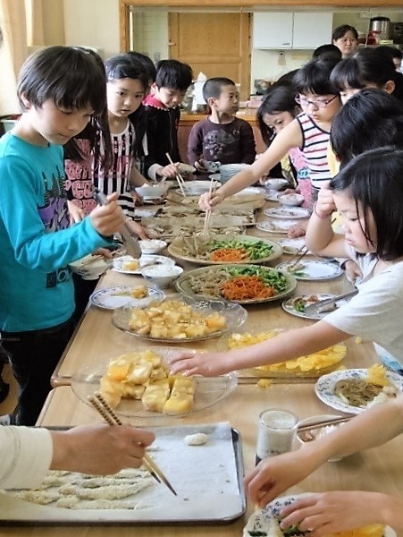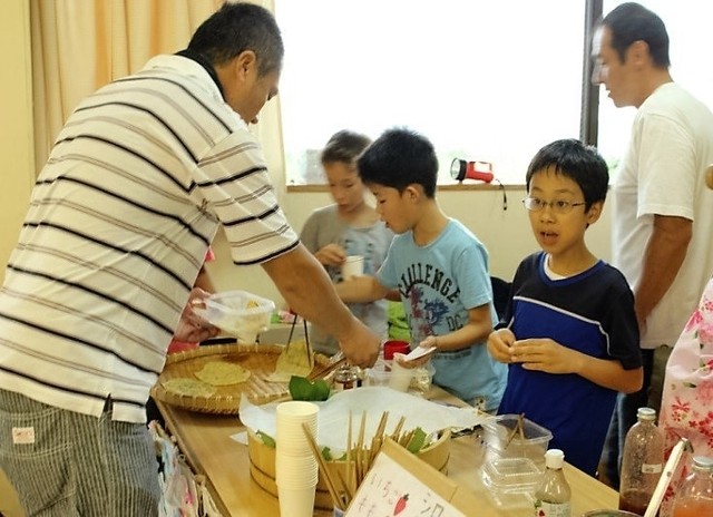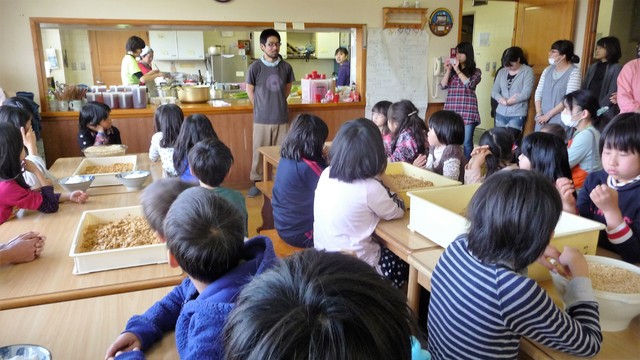 びわこ☆1・2・3キャンプでは、子どもたちが自分の生き方を人任せにせず、自分で考えて、行動できる大人になって欲しいという願いから、放射能のこと、平和のこと、食べ物のことなどを話してくださる講師を招いて勉強会を開いています。特に、食は直接身体の元になり健康にとって最も大切なものであるため、放射能だけでなく、添加物や 農薬などにも気をつけなければならないことや、手作りの大切さを伝えています。また、毎日の食事作りの手伝いで出汁の取り方を教えたり、春 キャンプの期間に翌年のキャンプに備えてみんなで味噌作りをしたりします。そのため、キャンプのお土産を買うときなどに原材料のラベルを確認 したり、お家の方から 「苦手だった味噌汁が好きになり、ファーストフードを食べたがらなくなりました。」と聞くようになりました。