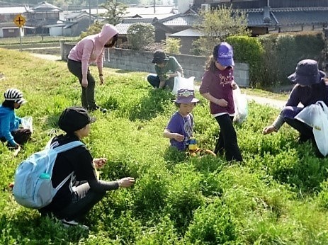 震災後初めての野草摘み。ヨモギを摘んで、持って帰る子も