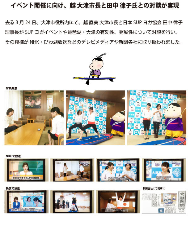 現在、大津市(行政)にも協力いただき、また日本SUPヨガ協会の後援のもと、理事長 田中 律子先生にも出演していただくイベント開催に向け、熱く活動を行っているます!!