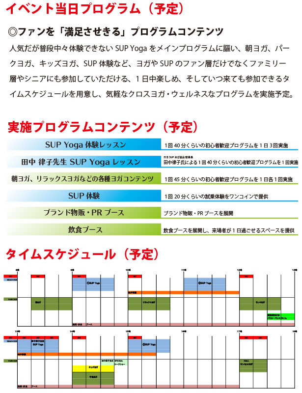 ヨガやSUPに興味のある方はもちろん、それ以外でも、性別年齢問わず本当にたくさんの方が『1日を通し楽しく・ゆっくり・健康に』過ごしていただけるイベントを目指しています。