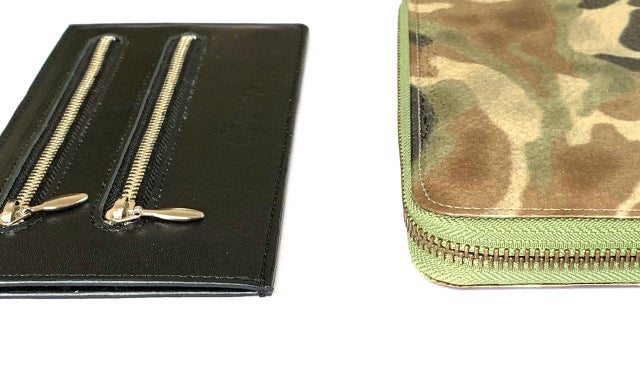 厚さは「Bizzet」4㎜(ファスナー金具部8㎜)、「ラウンドファスナー長財布」21㎜で見てのとおりです。