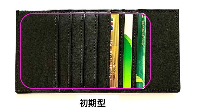 初期型は、財布の裏面(外側)に7枚のカードポケットをつくりましたが、入れにくく!取り出しにくい!カードが重なり厚みが出て不格好!