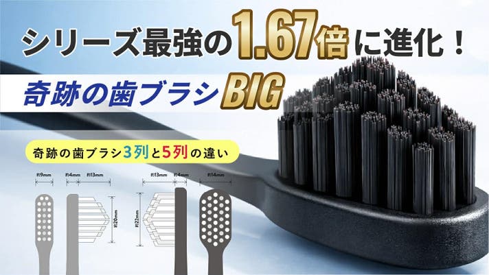この奇跡の歯ブラシが従来の3列ブラシを5列に拡張し、微細な竹炭を配合。「ホワイトニング※」をしながらより広く、効率的に磨ける設計に進化したモデルが「ホワイトニング※」×「奇跡の歯ブラシBIG」です。