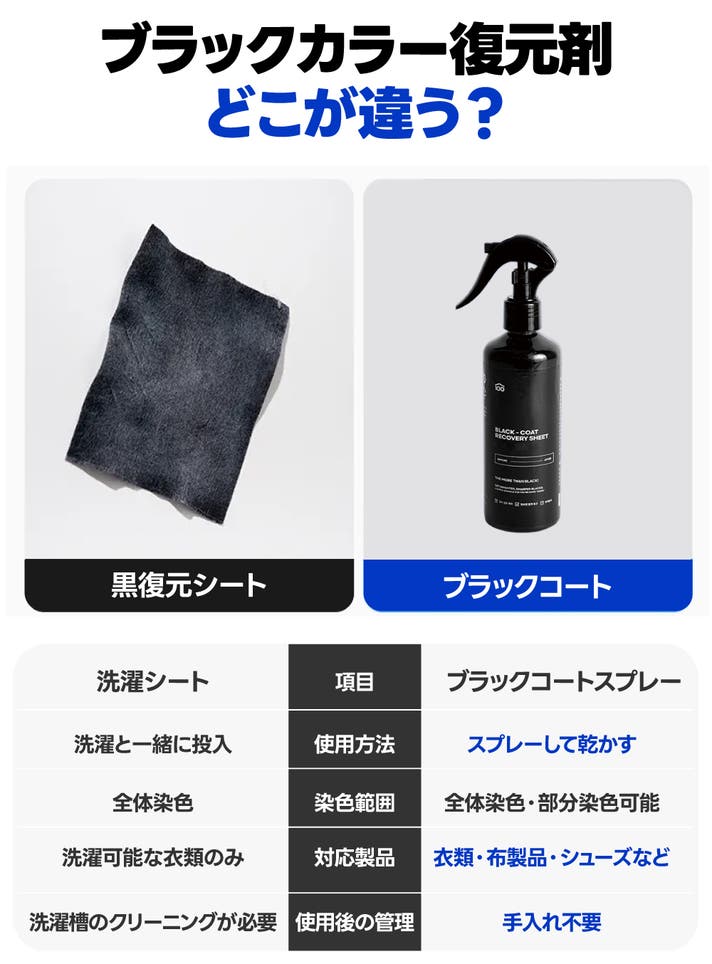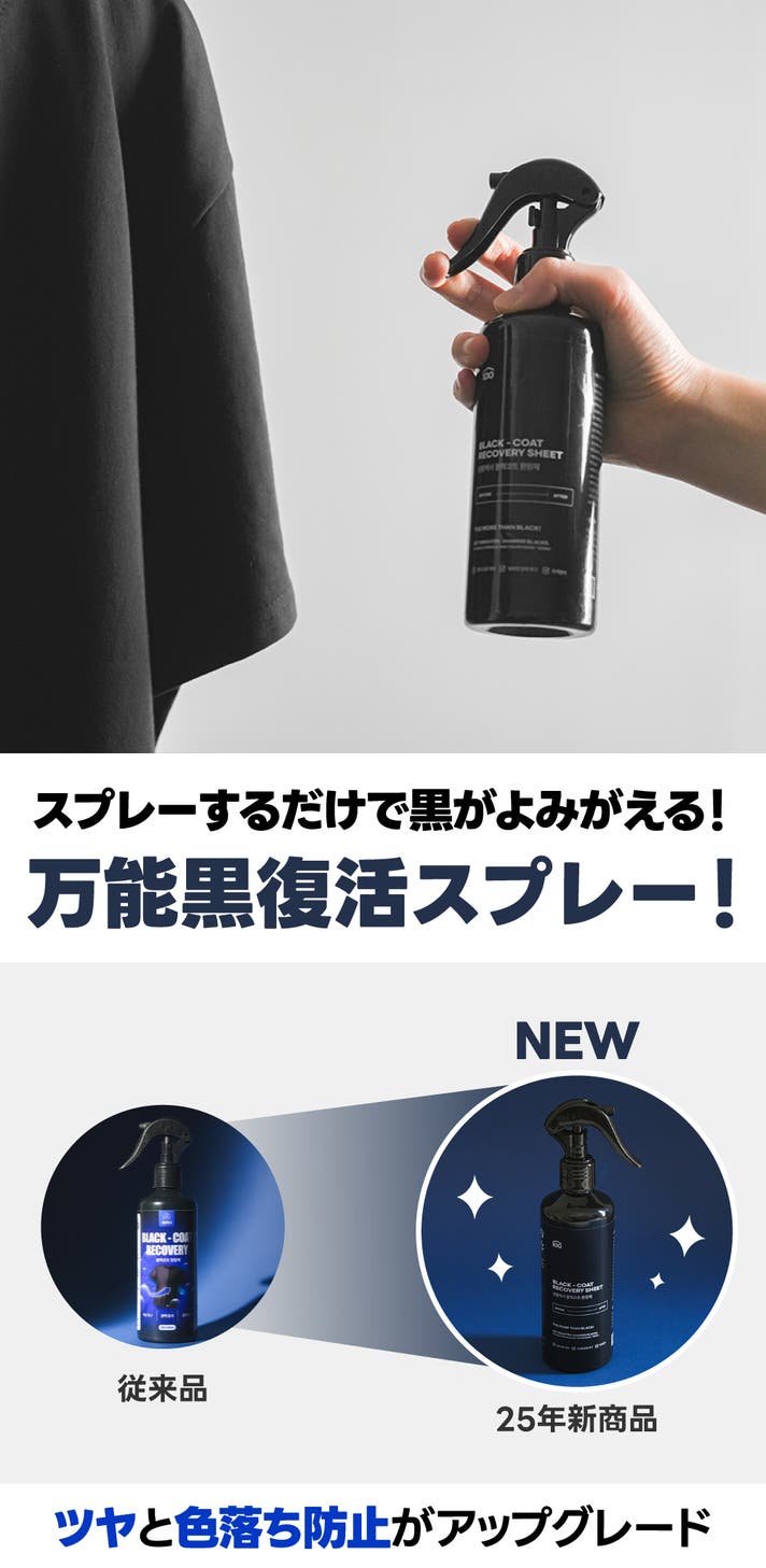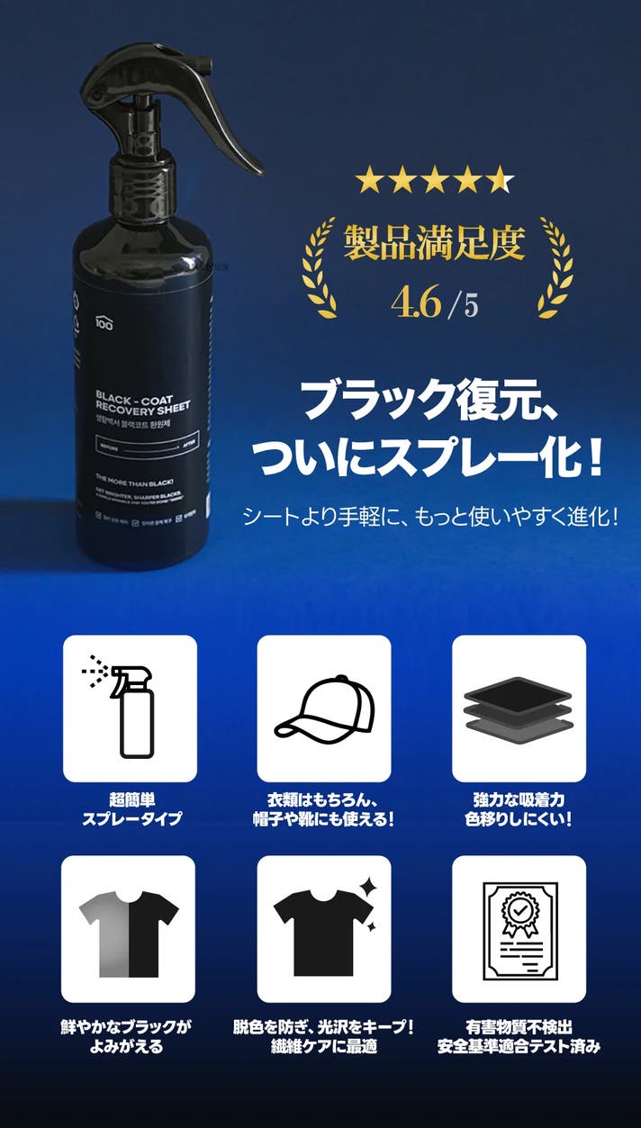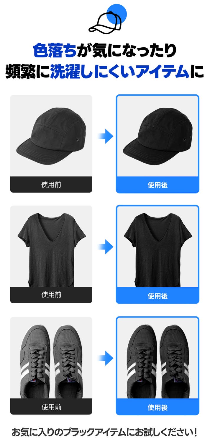 - 紫外線・汗・洗剤による色あせやくすみに!スプレーするだけで、手軽に黒さを取り戻せる