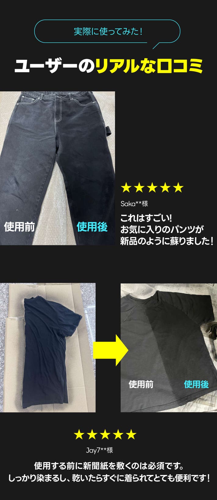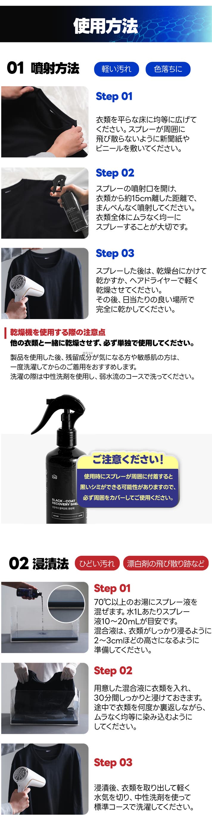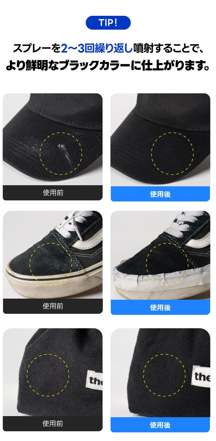 - 紫外線・汗・洗剤による色あせやくすみに!スプレーするだけで、手軽に黒さを取り戻せる