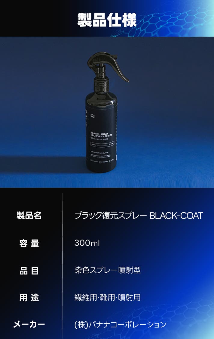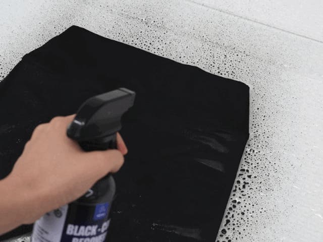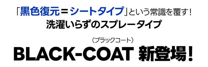 ブラックコートスプレーは、繊維トリートメントが配合されており、繊維をなめらかにコーティングしてツヤを高め色あせを防ぎます。